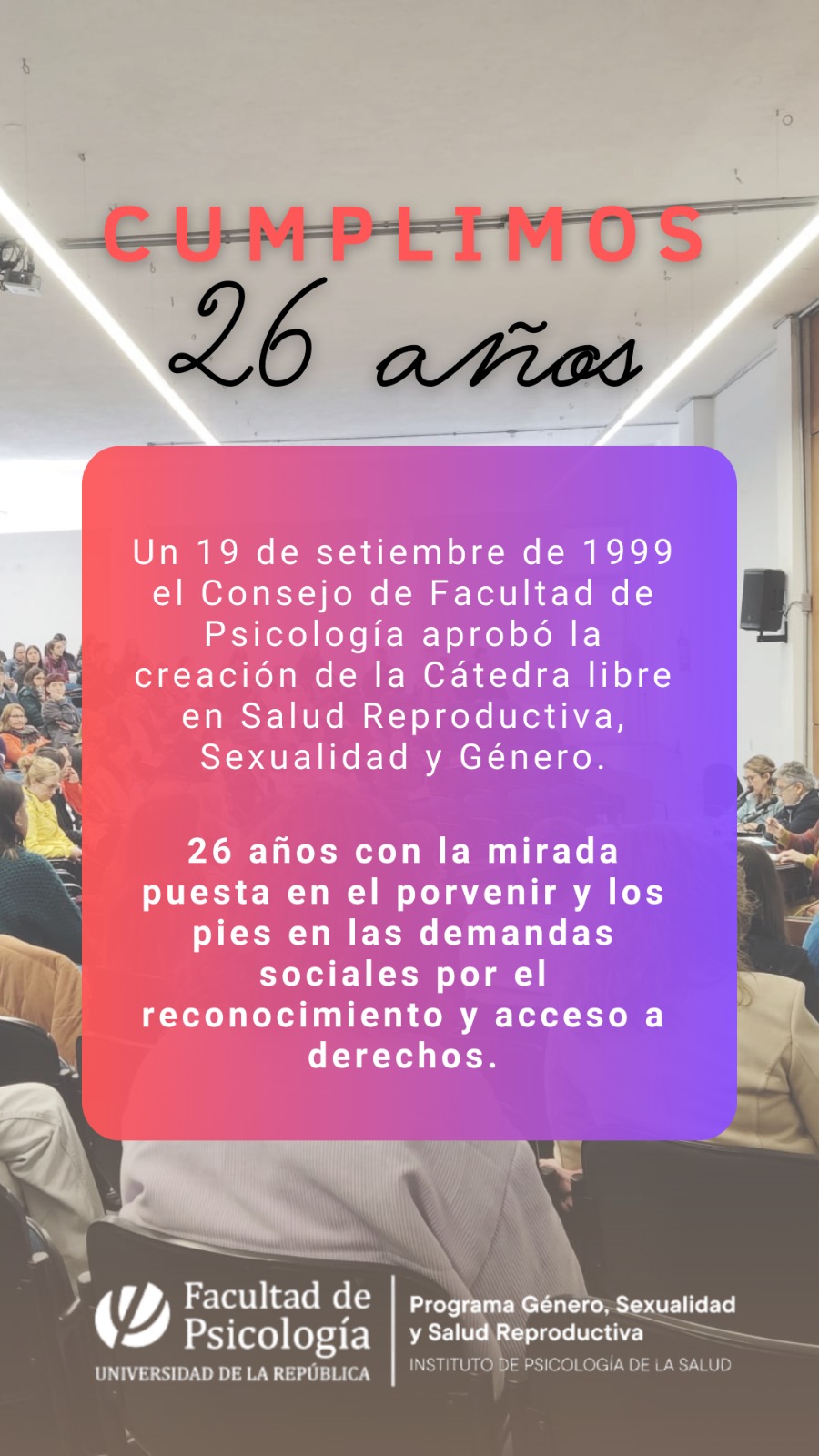 Hoy, 19 de setiembre, hace 26 años, el Consejo de la Facultad de Psicología de la Universidad de la República, creaba la Cátedra Libre en Salud Reproductiva, Sexualidad y Género que luego se transformó en el Programa Género, Sexualidad y Salud Reproductiva.