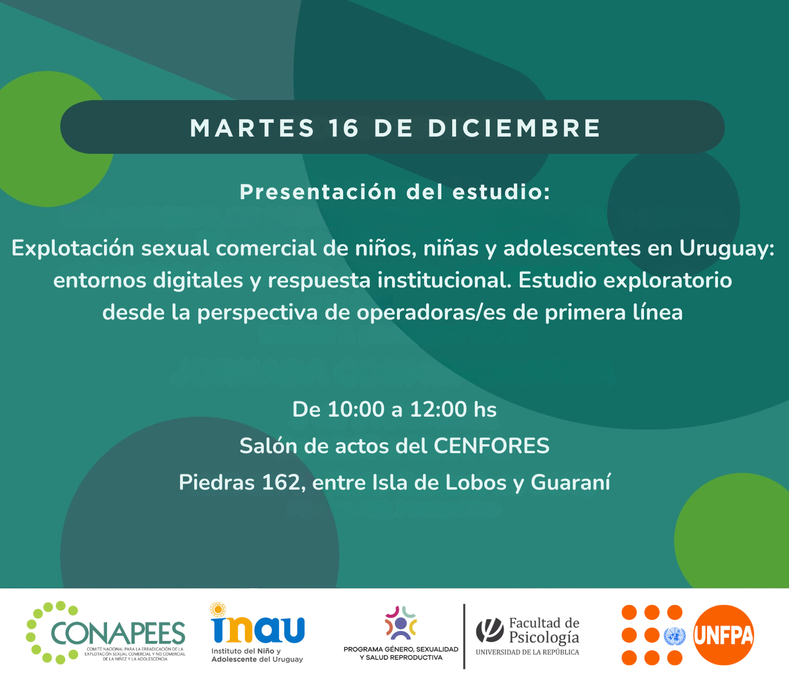 En el marco del Día Nacional contra la Explotación Sexual de Niños, Niñas y Adolescentes, el pasado 16 de diciembre el Programa con el apoyo del UNFPA presentó el estudio:  "Explotación sexual comercial de niños, niñas y adolescentes en Uruguay: Entornos digitales y respuesta institucional. Estudio exploratorio desde la perspectiva de operadoras/es de primera línea", con la presencia de autoridades de INAU y CONAPEES.
